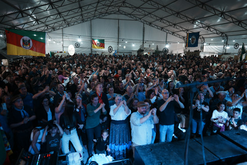 O público compareceu em grande número, lotando o espaço. Não havia lugar para dançar, e mesmo assim, de pertinho, todos acompanharam cada música da nossa apresentação. Um momento especial da tarde foi a chegada da Chama Crioula, em um ato que reforçou a tradição gaúcha e deu ainda mais significado à celebração.